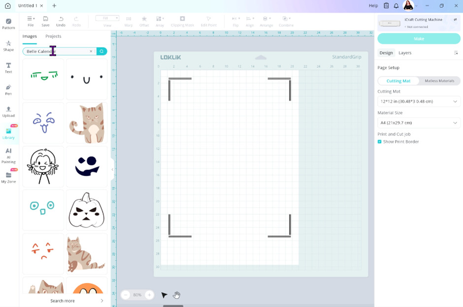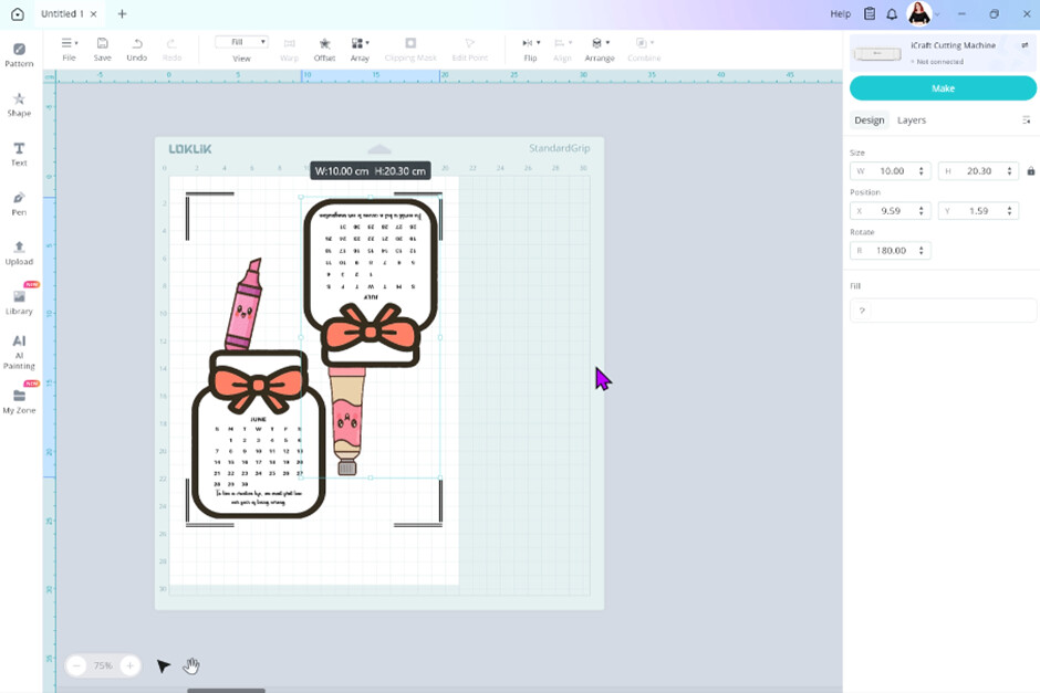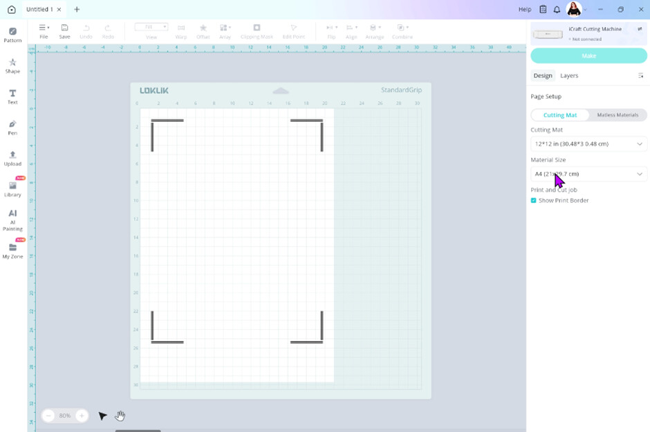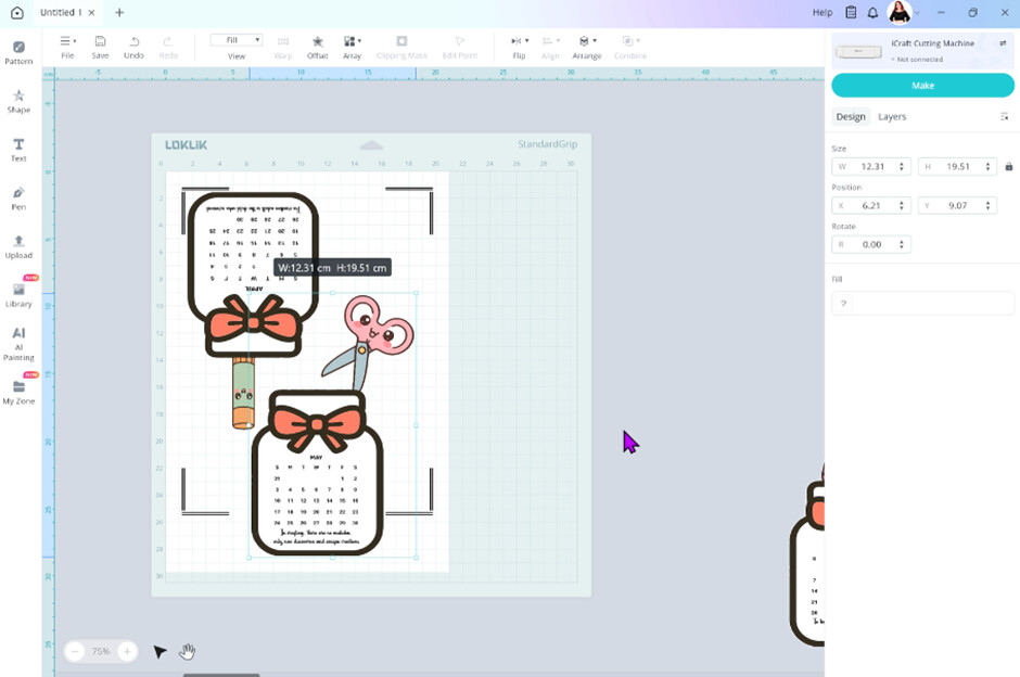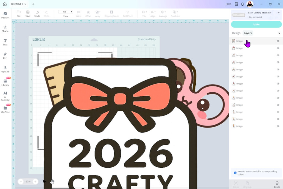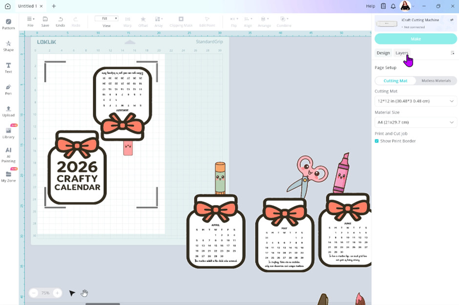 Now we can print then cut. Make sure your LOKLiK cutting machine is turned on and connected to IdeaStudio. Select the first two layers and press the eye button to unhide them. You should only see both those layers on your canvas at this point. Now click make