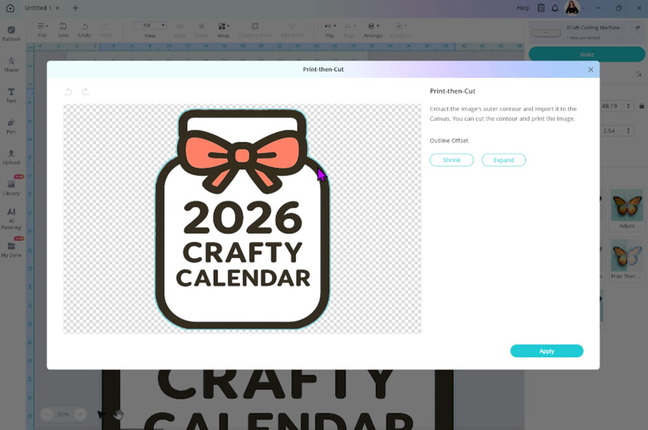 Wait for IdeaStudio to extract the image. When it’s finished you will notice a blue line around your image. This blue line represents the cutting line. Now you can move it closer to your image by using the shrink button, or further away from your image using the expand button. I was happy where the line was so I left it and pressed apply.