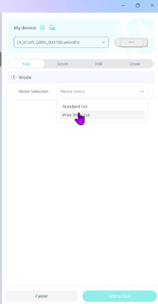 Under mode selection click on print then cut. Make sure your material size is correct.