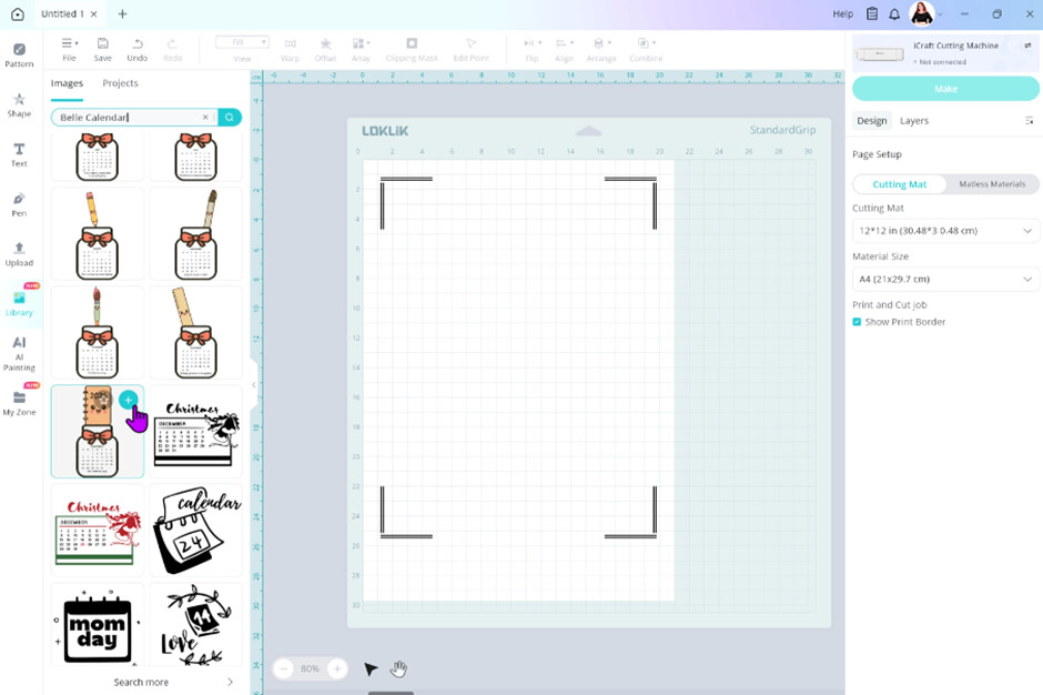 After hitting the search button, all the calendar images should appear. Going from bottom to top, add each image to your canvas by clicking the blue plus button on the top right corner of each image. Going from bottom to top, will add our images in order in our layers panel. There are 13 images in total to add to your canvas.